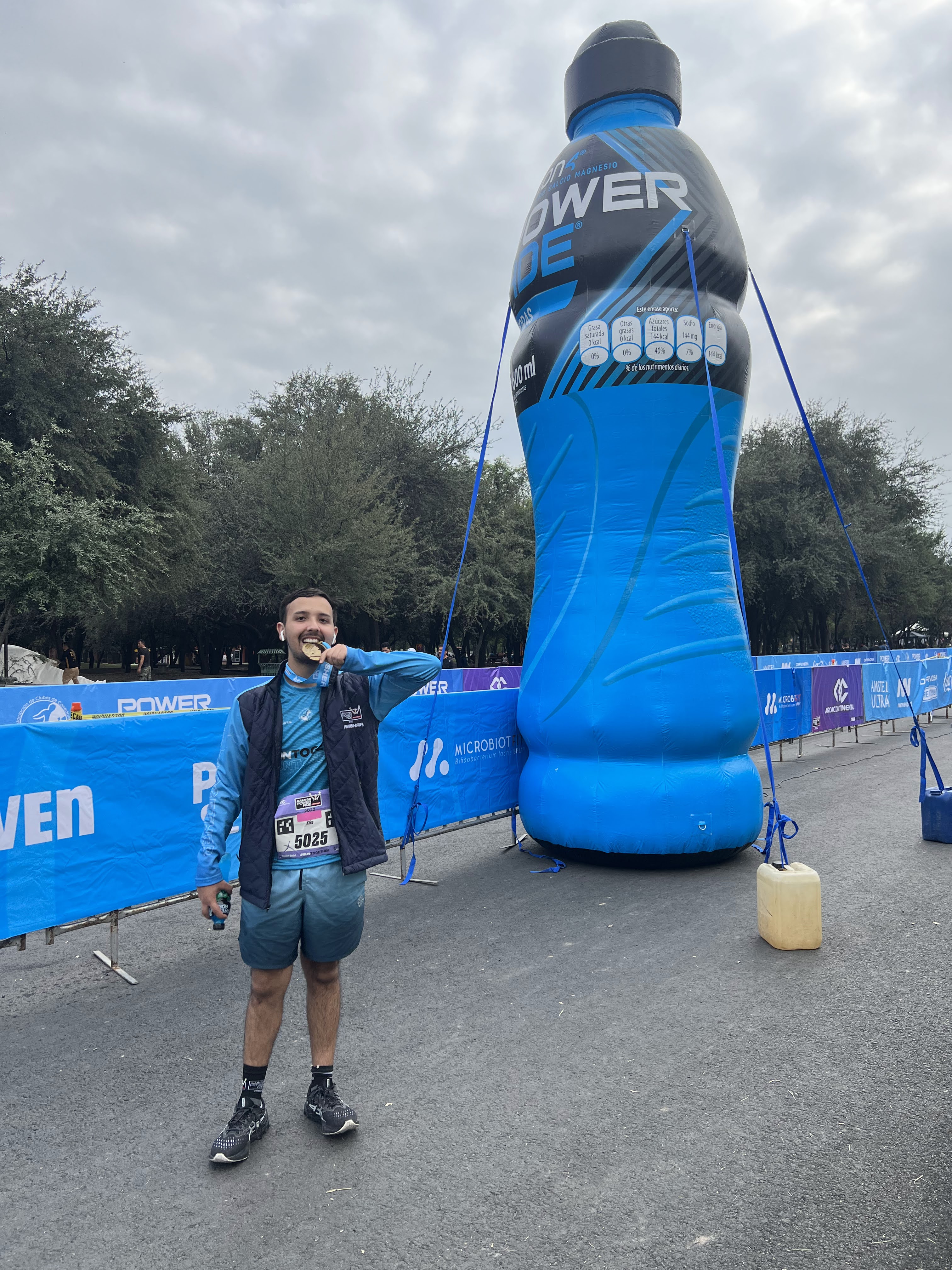 Me tocó rebasar al padre Paco, un sacerdote muy reconocido por la comunidad y que traía porra a lo largo de todo el trayecto. No recuerdo su edad ni la cantidad de maratones que había completado, pero eran más de 50 años y más de 50 maratones. Algo increíble. También se le acabó la batería a mis audífonos y los últimos 15 kilómetros los hice sin música. A partir del kilómetro 36 ya mi energía física estaba muy baja pero rendirse a 6 kilómetros de la meta no lo veía como opción. Hubo un último obstáculo que por poco me deja fuera a tan solo 4 kilómetros de la meta. Como constantemente me iba hidratando, me dieron ganas de ir al baño, y en efecto había baños portátiles instalados en el circuito, pero mi cuerpo se desentendió después de deshidratarme un poco sentí un retorcijón muy fuerte en mi estómago/entrepierna y por un momento pensé que hasta ahí había llegado. Pero a pesar de sentir dolor muy fuerte empecé a trotar y concentrarme en mi respiración hasta que el dolor se fue desvaneciendo.